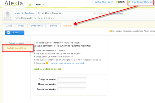 Una vez te has registrado en la plataforma, debes dirigirte a la parte superior derecha donde encontrarás tu nombre. Pulsando sobre el mismo accederás a la pestaña "Usuario" y desde aquí podrás seleccionar el apartado "Código de acceso" donde encontrarás las instrucciones para modificar la contraseña. |