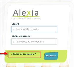 | En caso de olvidar la contraseña de acceso debes dirigirte a la página de acceso de Alexia web y pulsar sobre el botón "¿Olvidó su contraseña?". |