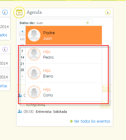 En Alexia web puedes consultar la agenda de cada uno de tus hijos que están matriculados en el centro escolar. En el desplegable de la parte superior de la agenda debes elegir el nombre del hijo y a continuación podrás consultar todas las citas programadas de su agenda.