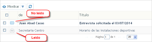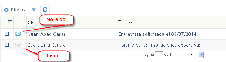 | En el apartado de "Comunicados" tienes acceso al listado de comunicados recibidos y el icono en forma de sobre abierto o cerrado te permite identificar rápidamente aquellos mensajes pendientes de lectura. |