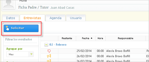 Para solicitar una entrevista debes pulsar el botón de "Solicitar" del apartado de "Entrevistas" y completar los datos que se solicitan a continuación: