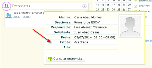 Una vez realizada la solicitud podrás consultar su estado desde el apartado de "Entrevistas" de la página inicial de Alexia web. Por ejemplo, si el tutor o profesor la ha confirmado podrás ver en su estado como "Aceptada". También podrás cancelarla, si fuese necesario. (El tutor o profesor, en ese caso recibirá, un comunicado informando de la cancelación de la misma).