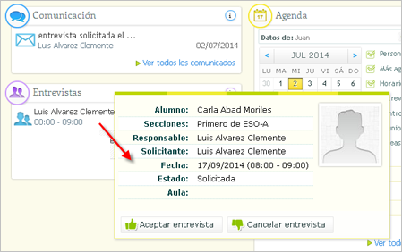 Además, en el apartado de "Entrevistas" de la página de inicio, ésta también aparecerá y podrás aceptarla o rechazarla, según sea el caso. Situando el cursor encima de la entrevista aparece una ventana emergente donde puedes realizar estas acciones.